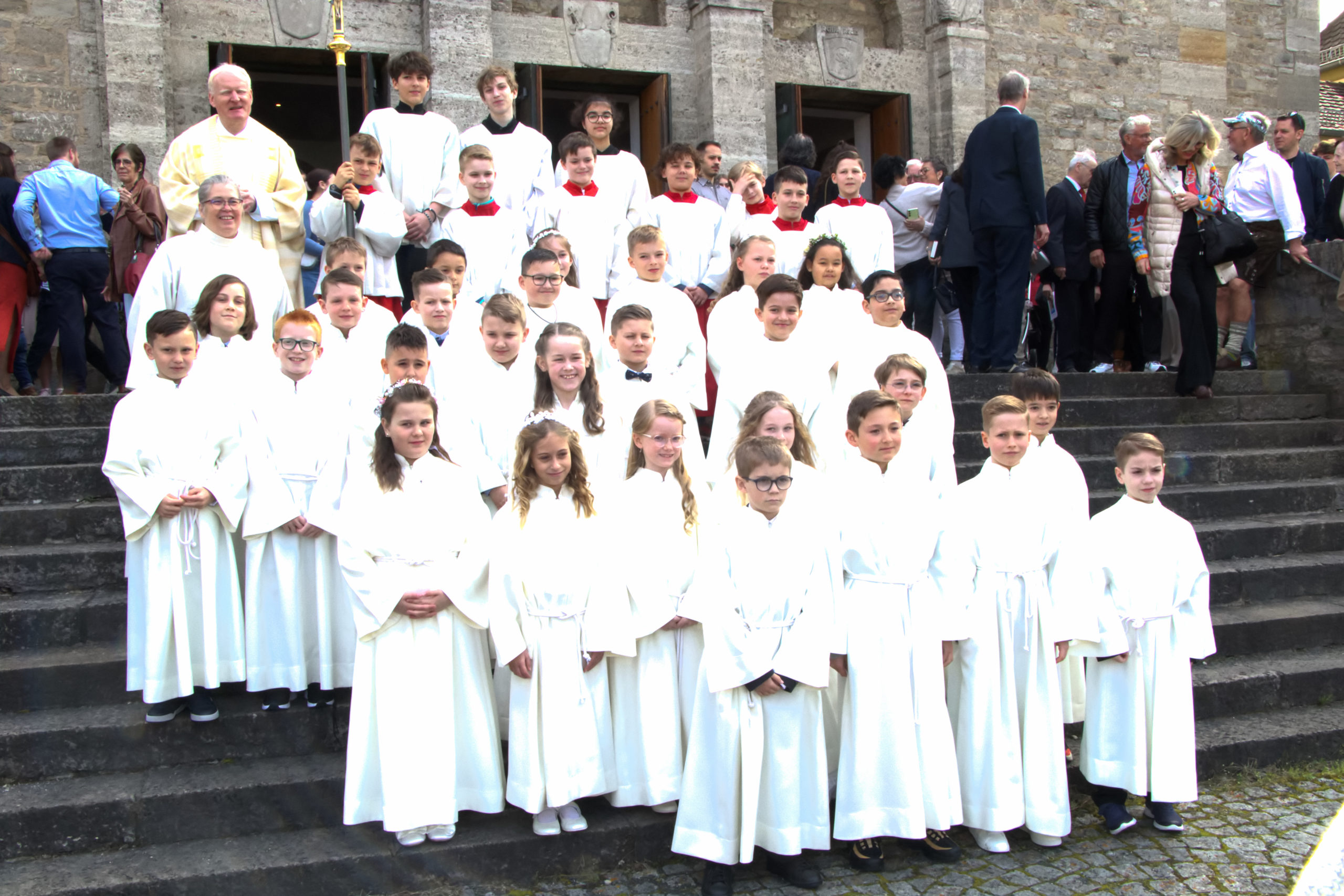 Am weißen Sonntag sind hier in St. Laurentius 28 Kinder zur Erstkommunion gegangen. Die Kirche war brechend voll und surrte wie ein Bienenstock. Gestartet ist die Gruppe der Kommiunionkinder im Hof der Walther-Schule von dort sind sie begleitet von den Laurentiusmusikanten und den Ministranten,