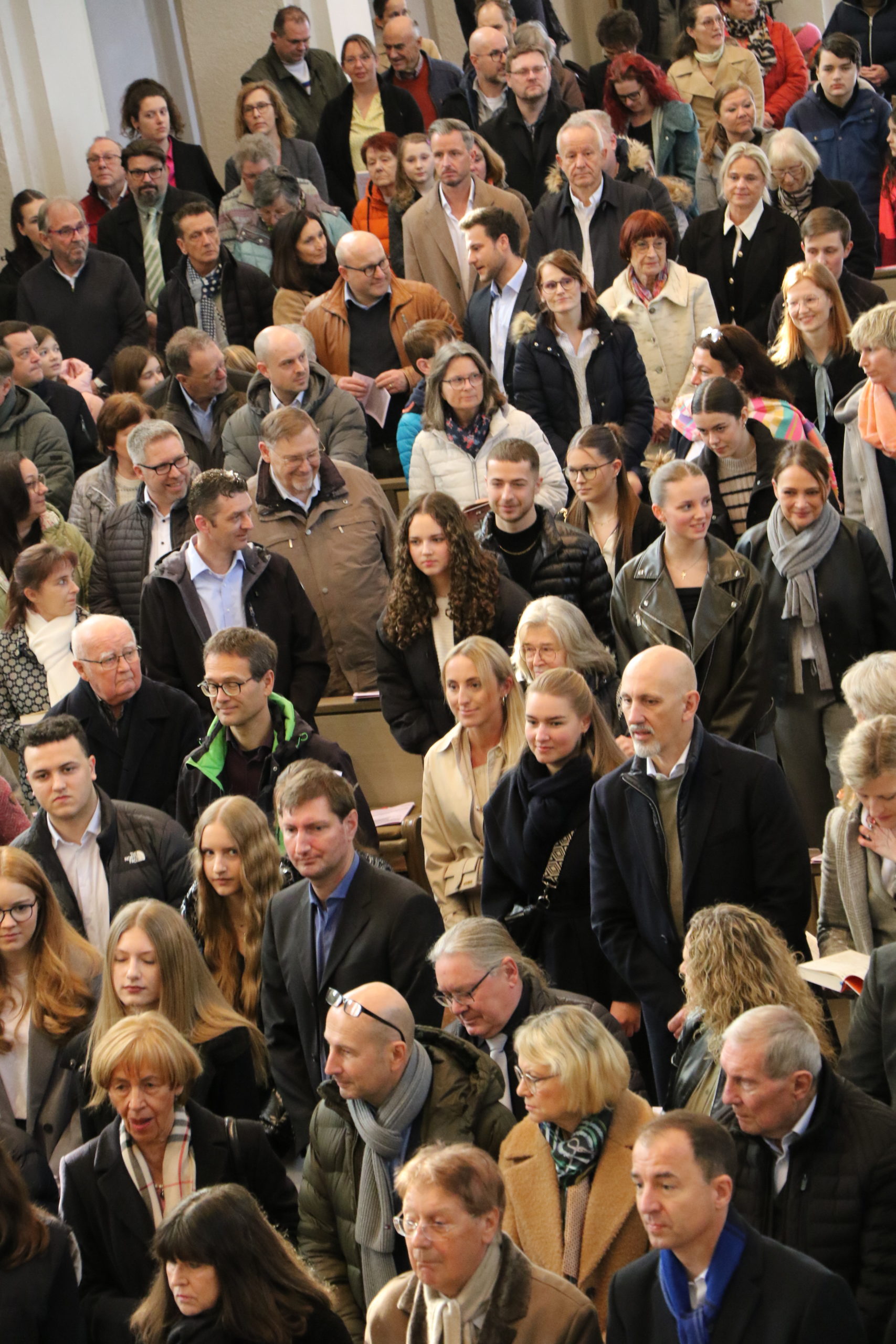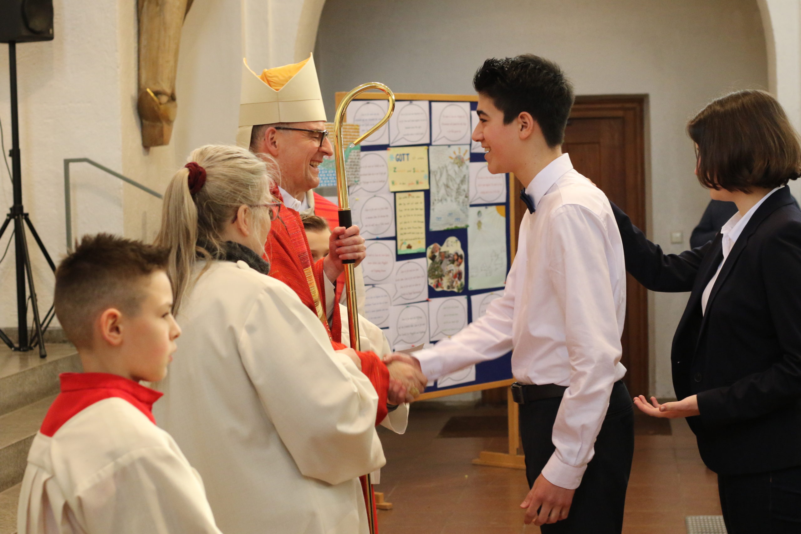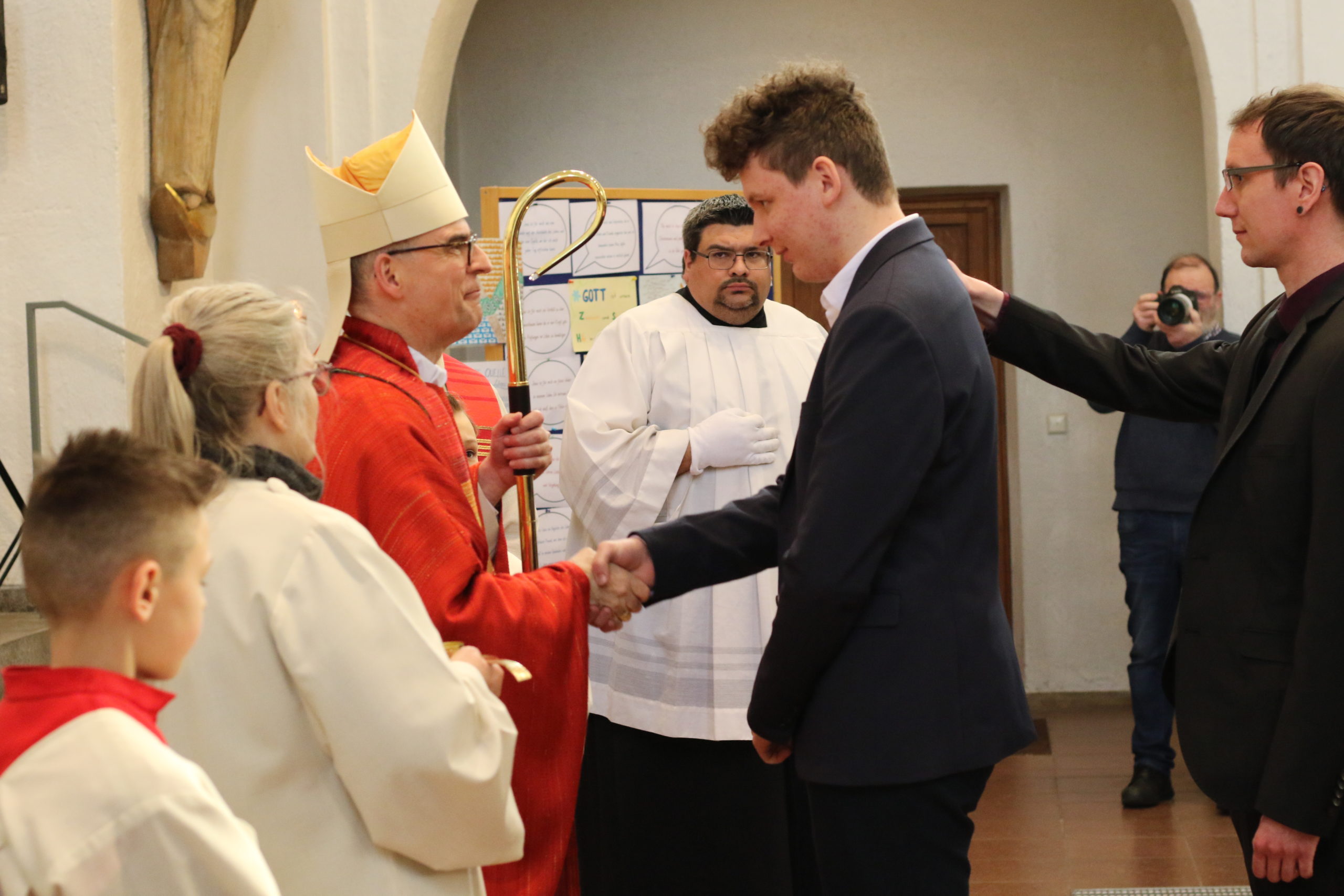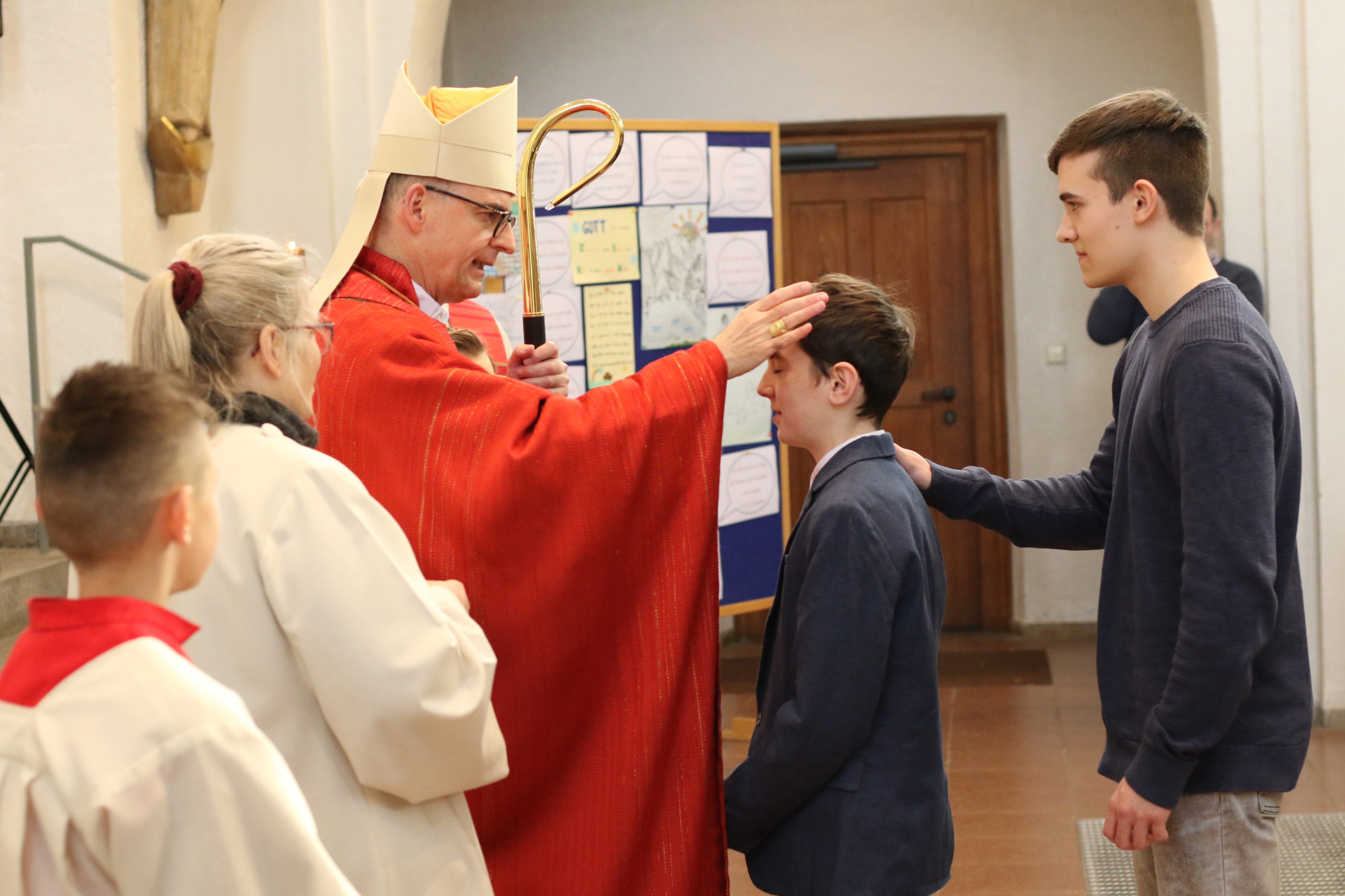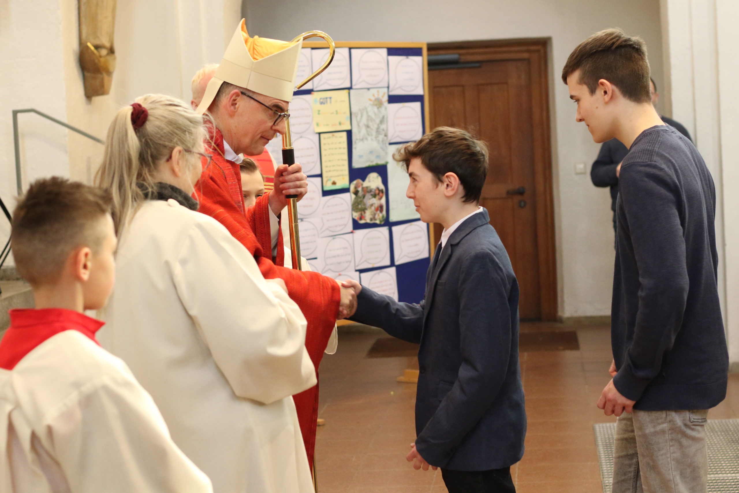 Die schwungvolle musikalische Gestaltung übernahm die Band Himmelwärts und ein gemischter Chor aus den drei Pfarreien unter der Leitung von Hendrik Frank. Ministranten aus allen drei Pfarreien haben den Gottesdienst festlich mitgestaltet. Zwei der Neugefirmten begrüßten und verabschiedeten gekonnt und soverän Bischof Jung und dankten ihm. Die Neugefirmten stellten verschiedene Ergebnisse aus der Vorbereitung vor.