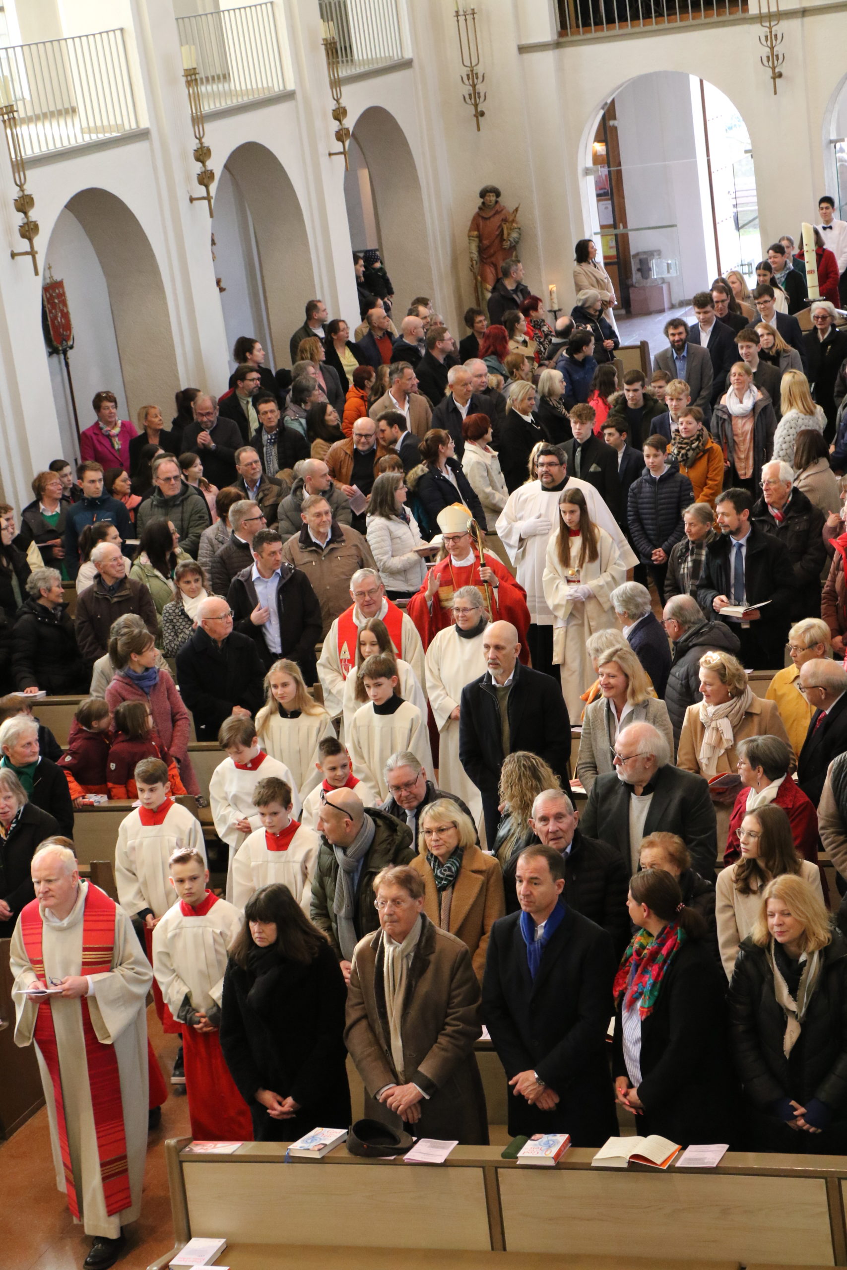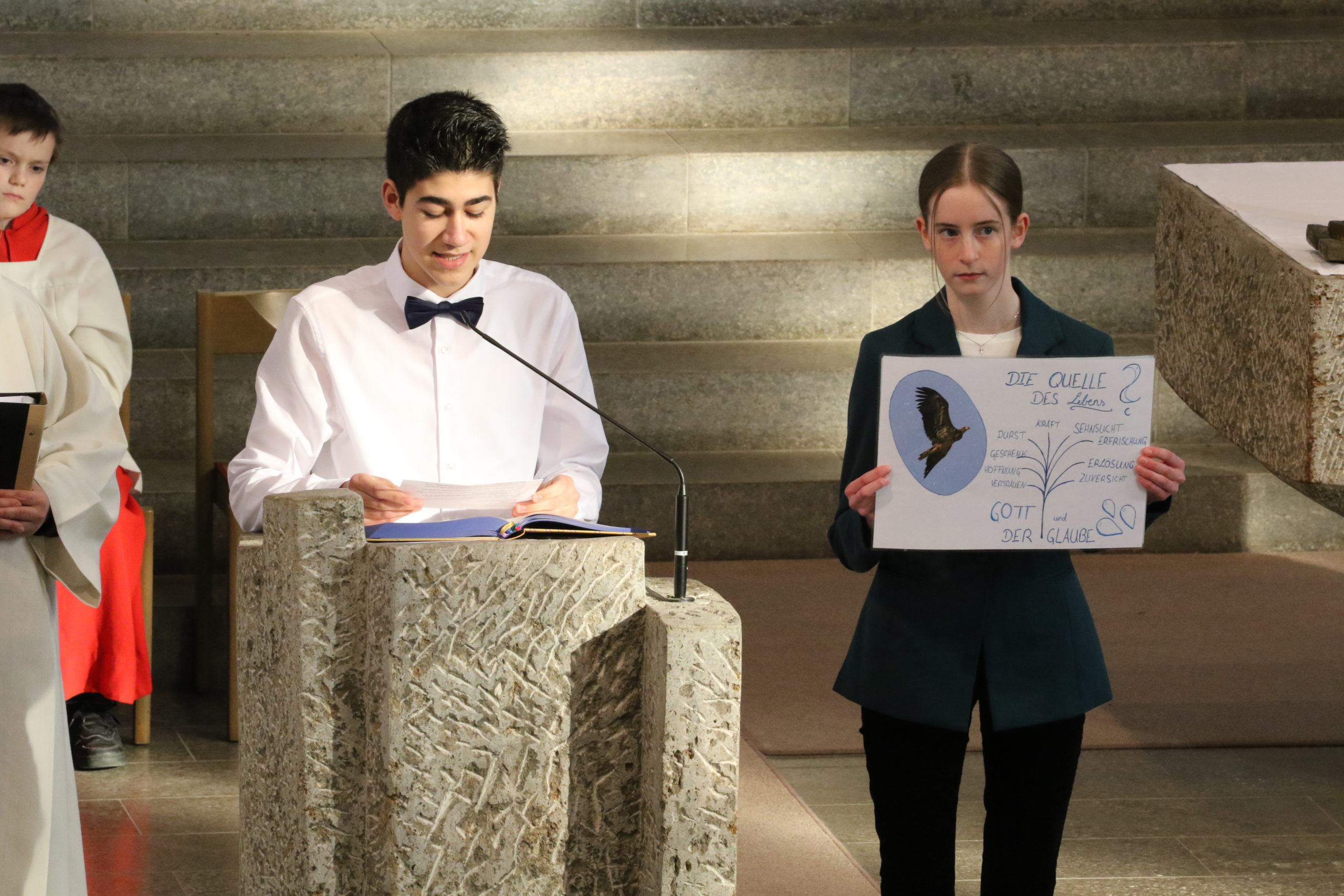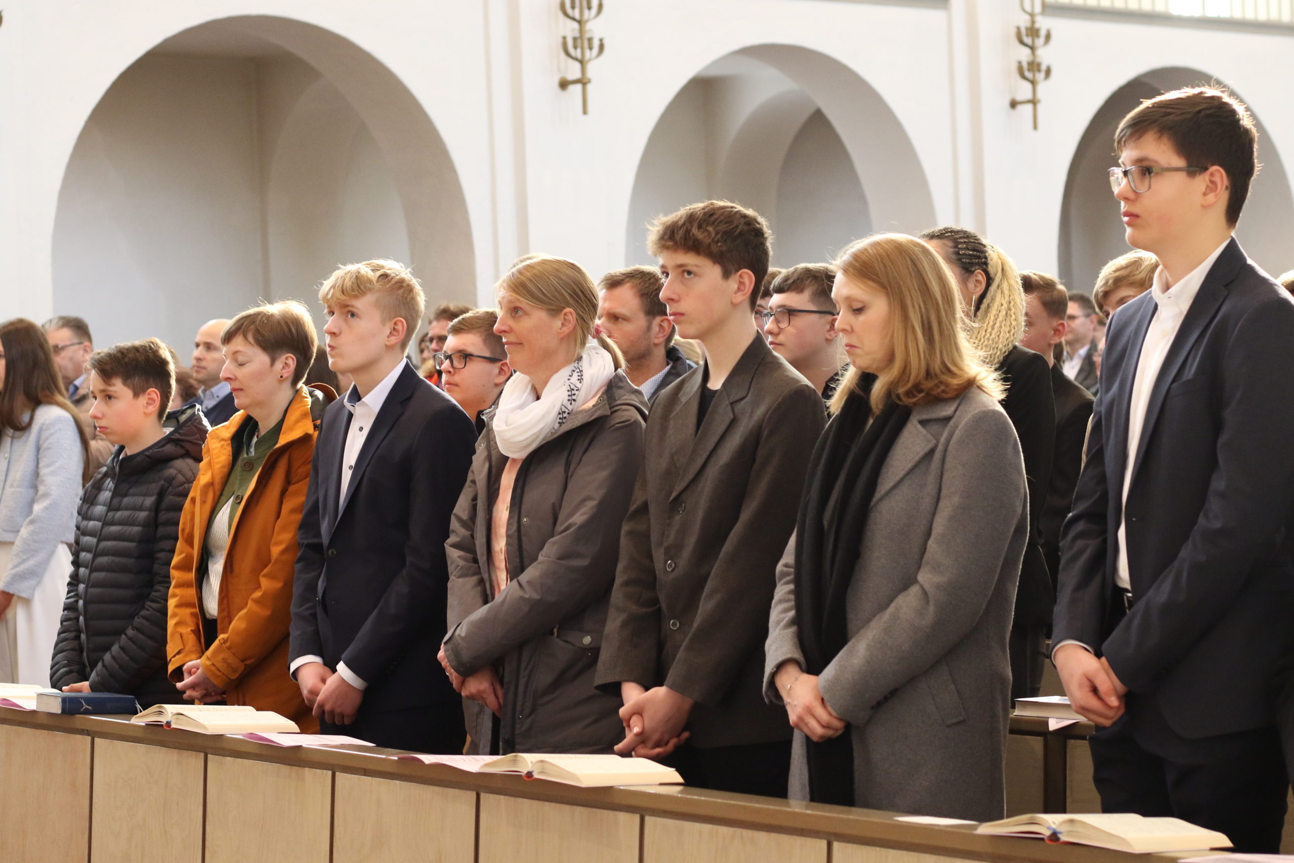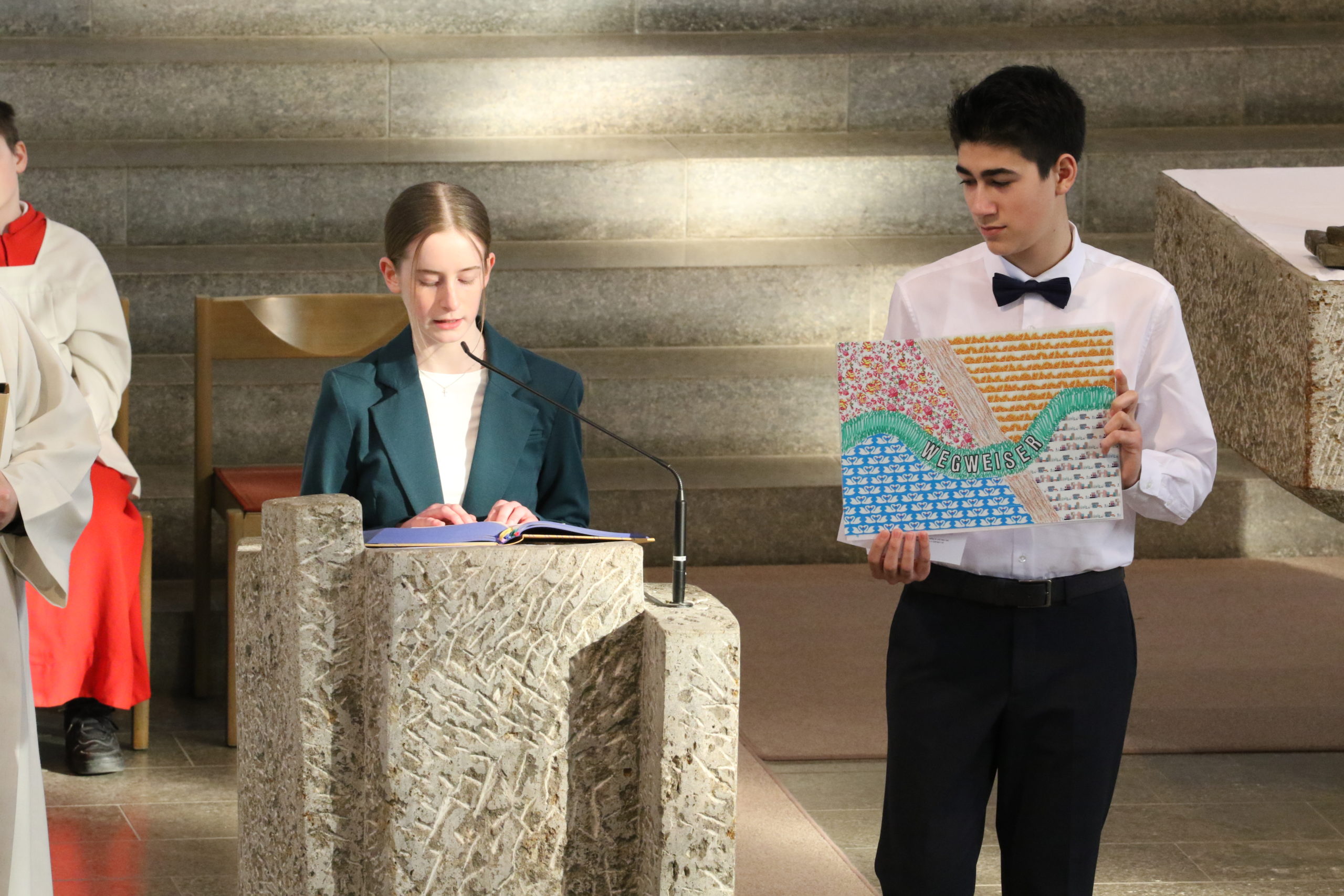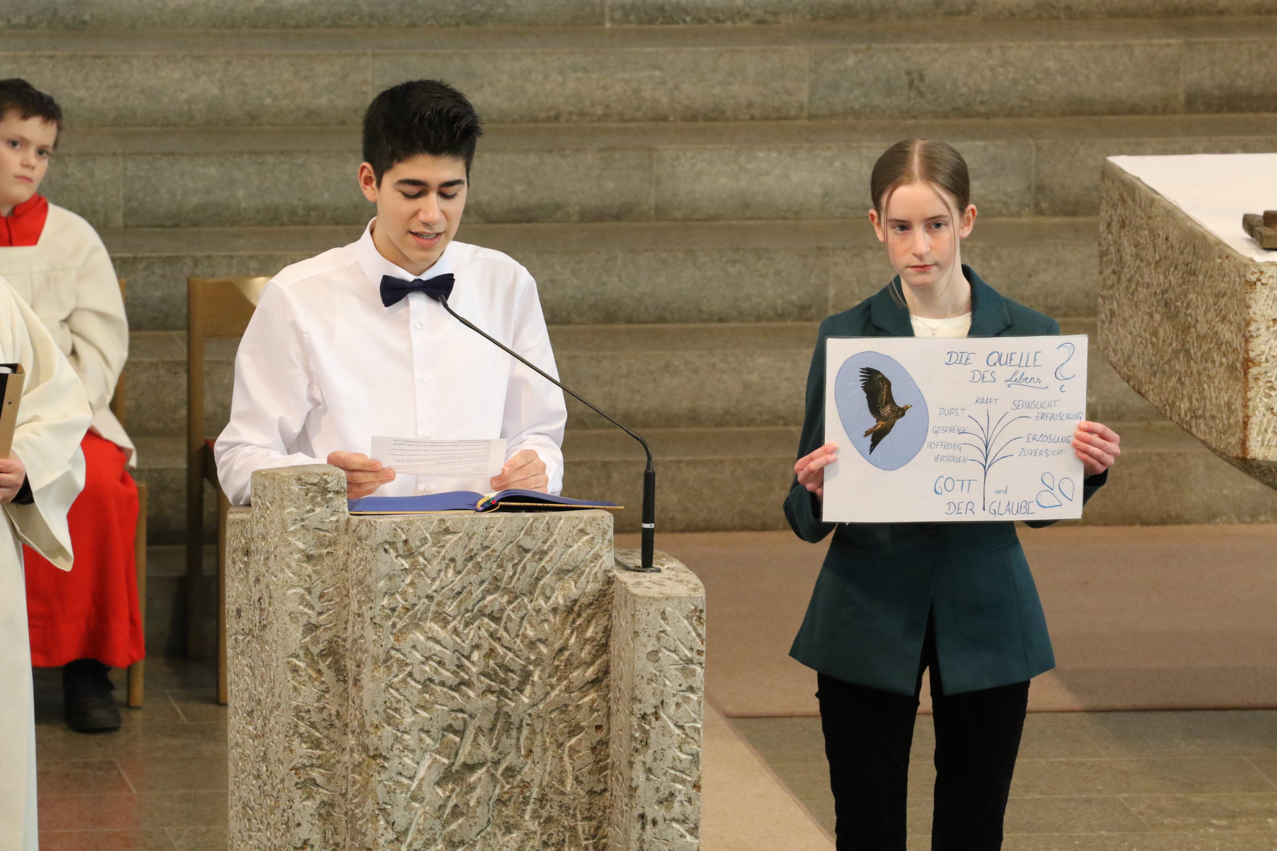 Die schwungvolle musikalische Gestaltung übernahm die Band Himmelwärts und ein gemischter Chor aus den drei Pfarreien unter der Leitung von Hendrik Frank. Ministranten aus allen drei Pfarreien haben den Gottesdienst festlich mitgestaltet. Zwei der Neugefirmten begrüßten und verabschiedeten gekonnt und soverän Bischof Jung und dankten ihm. Die Neugefirmten stellten verschiedene Ergebnisse aus der Vorbereitung vor.