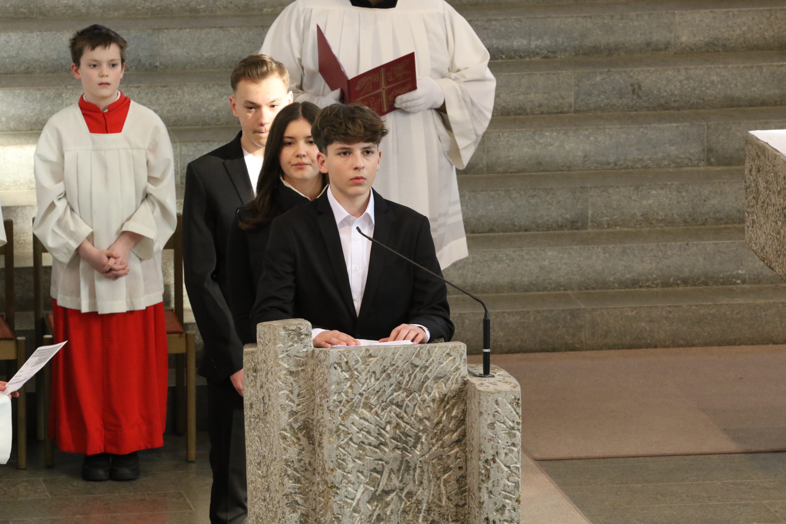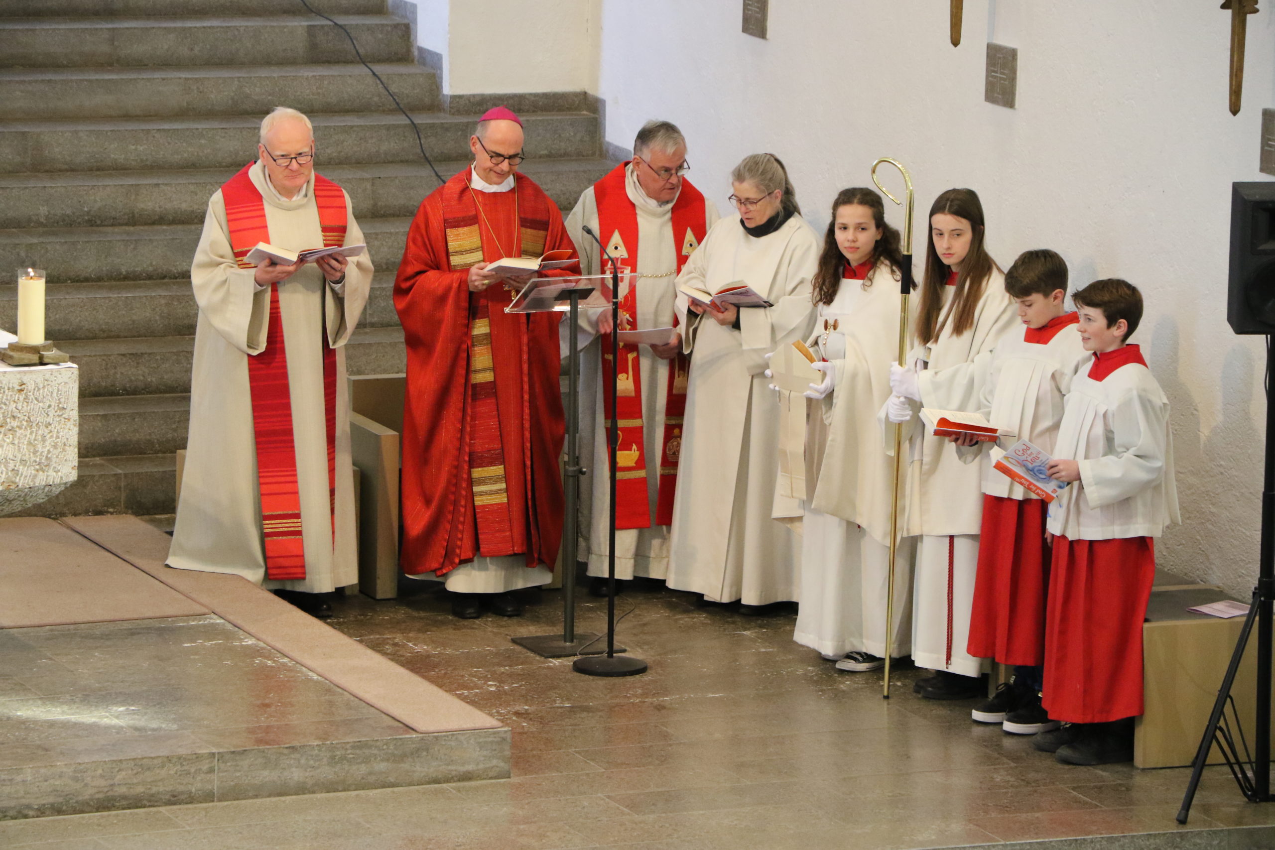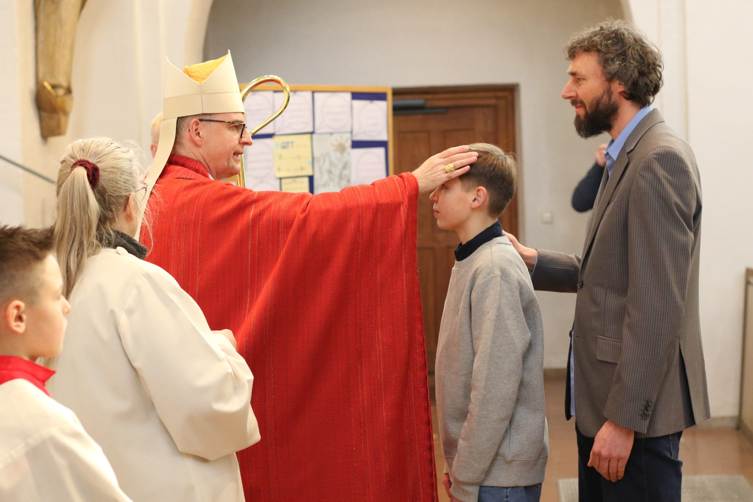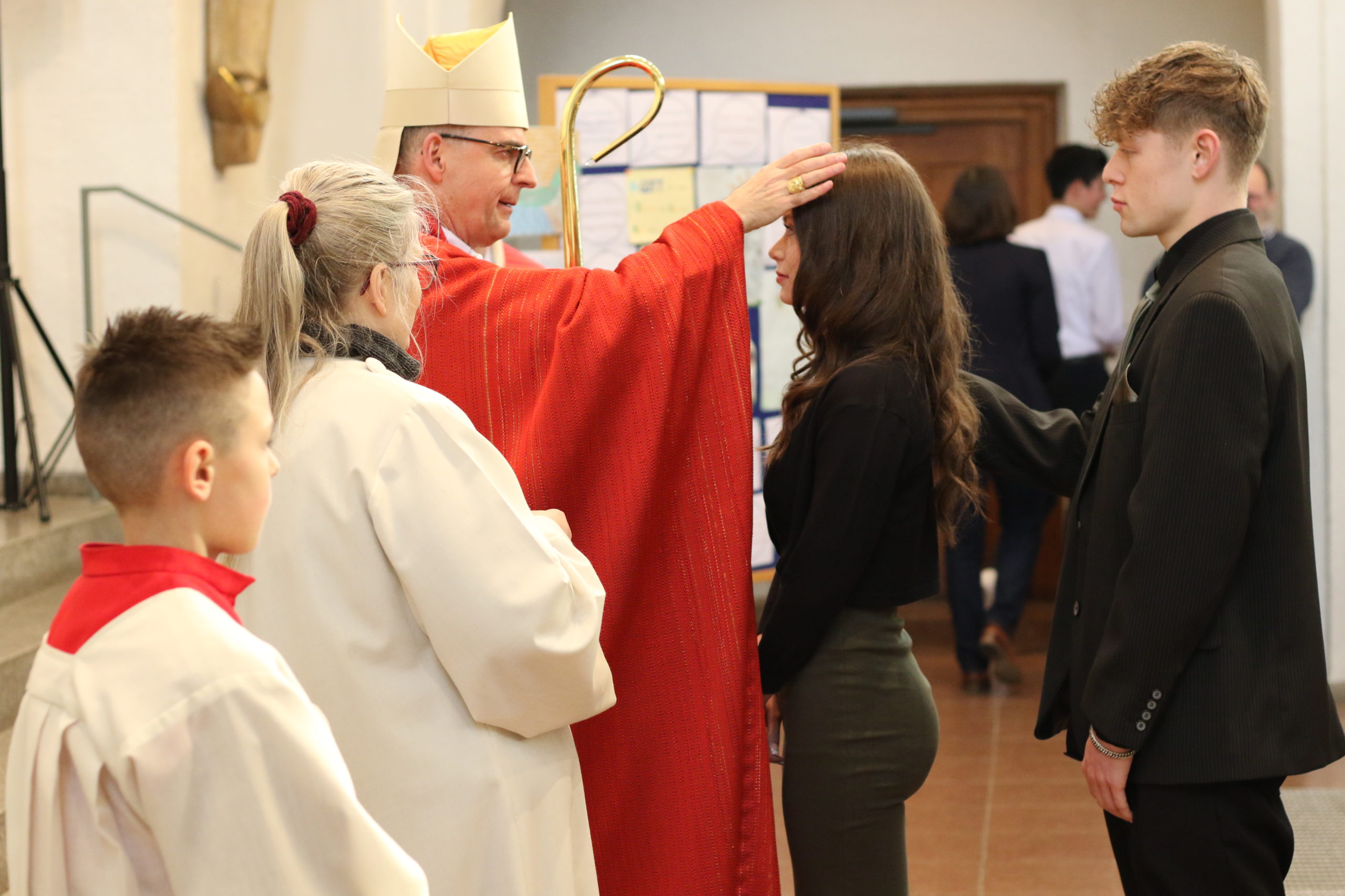 Die schwungvolle musikalische Gestaltung übernahm die Band Himmelwärts und ein gemischter Chor aus den drei Pfarreien unter der Leitung von Hendrik Frank. Ministranten aus allen drei Pfarreien haben den Gottesdienst festlich mitgestaltet. Zwei der Neugefirmten begrüßten und verabschiedeten gekonnt und soverän Bischof Jung und dankten ihm. Die Neugefirmten stellten verschiedene Ergebnisse aus der Vorbereitung vor.
