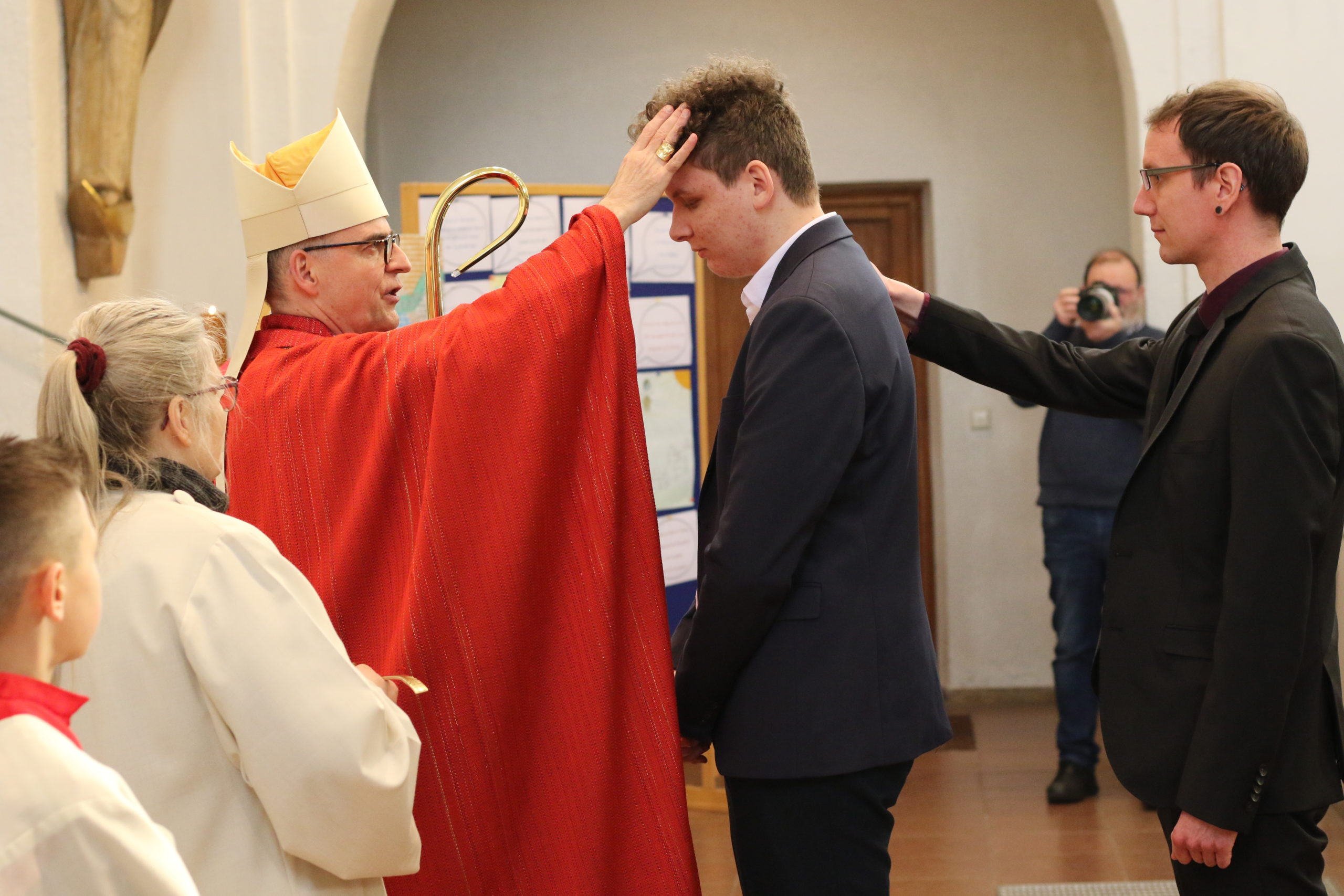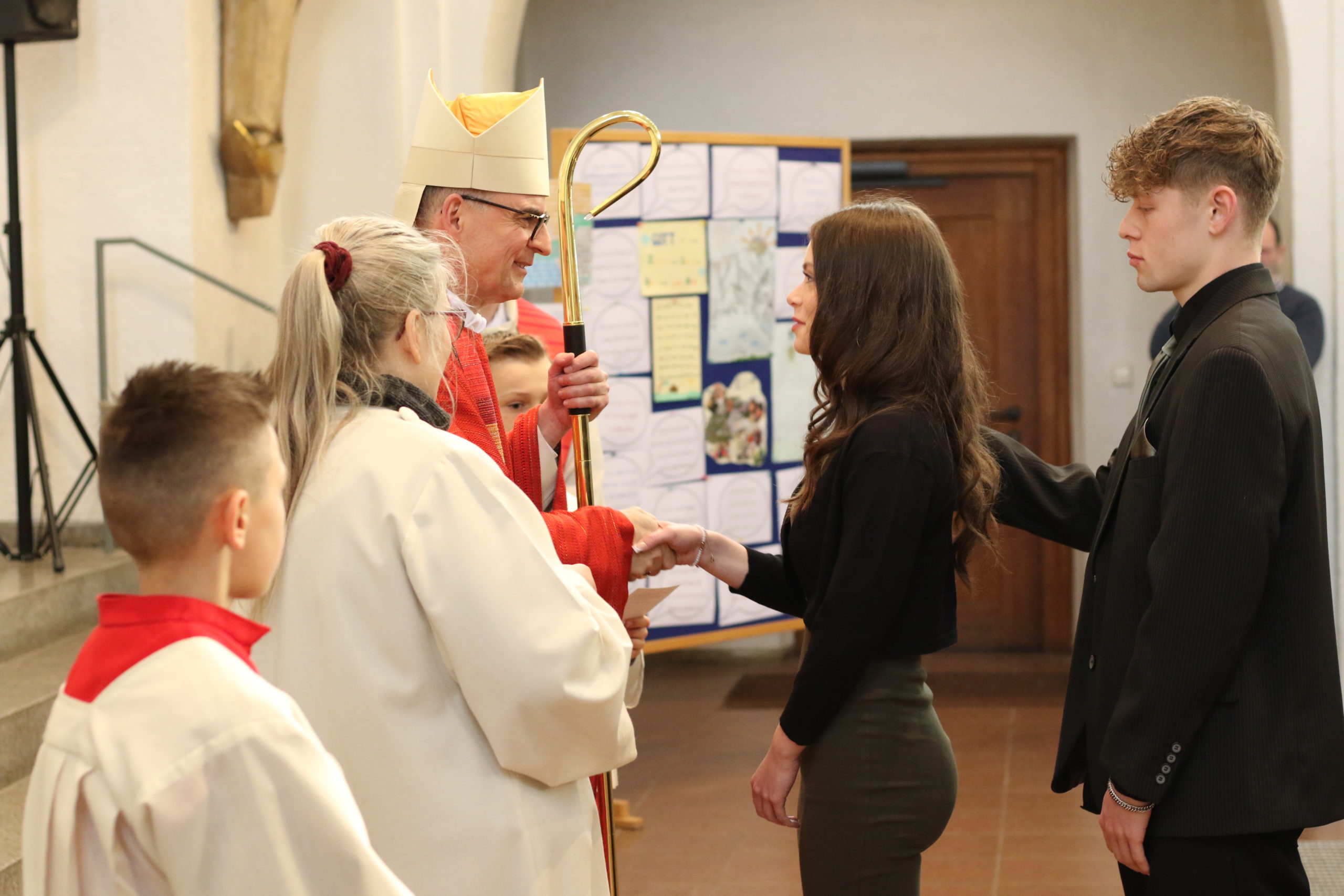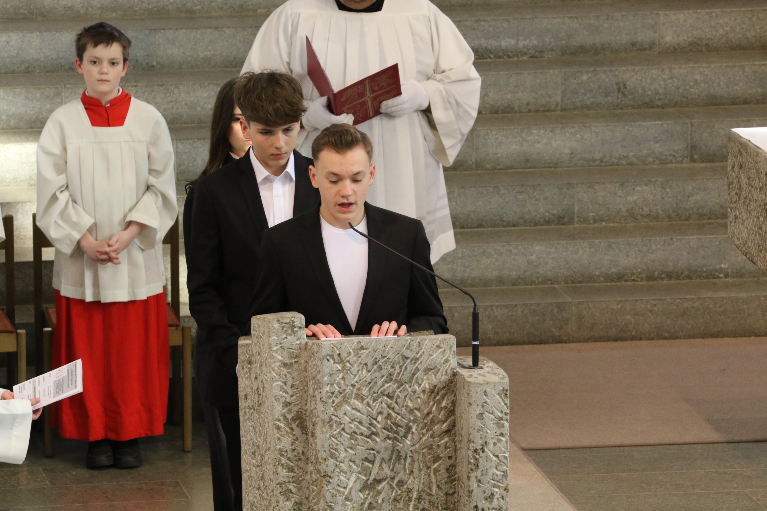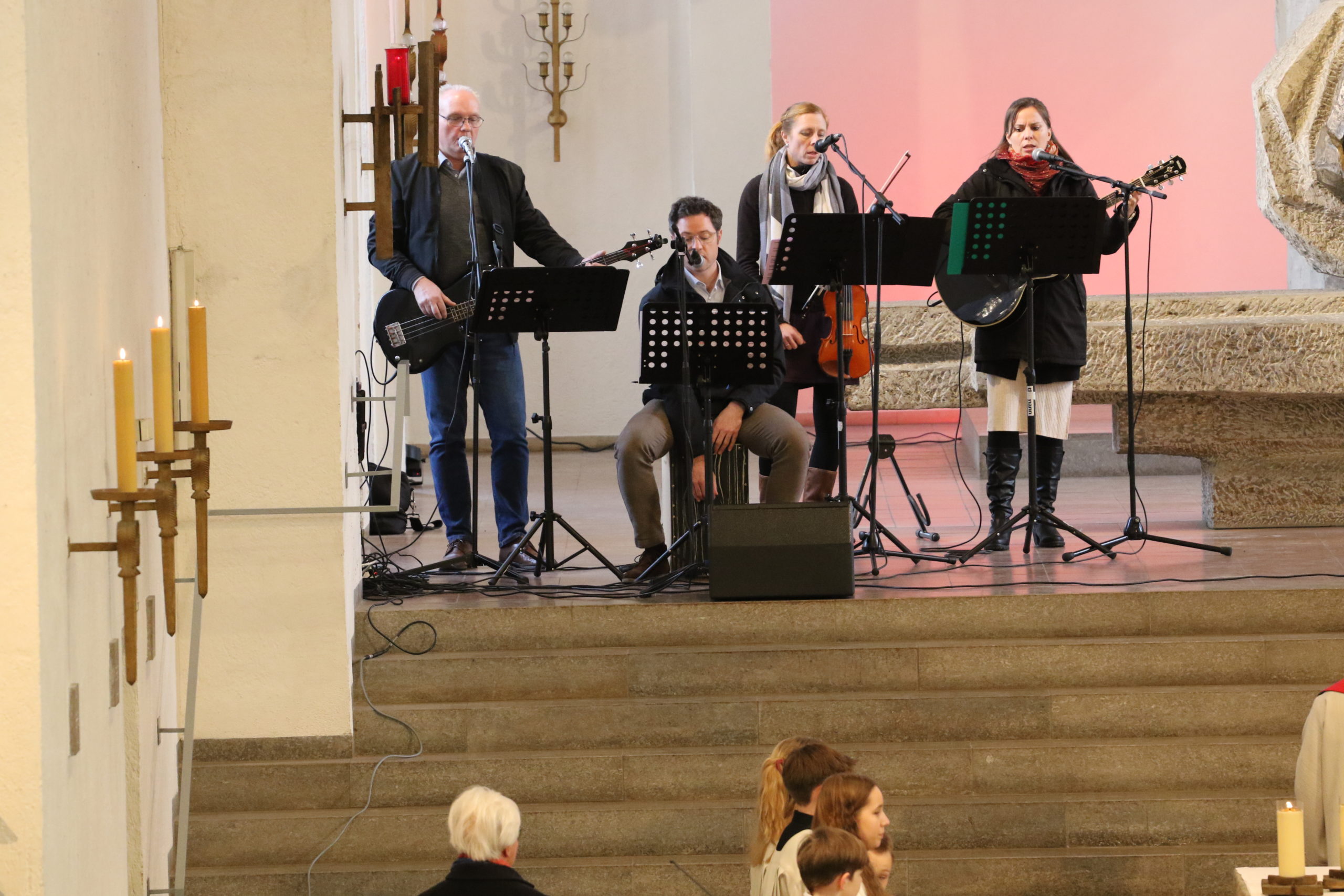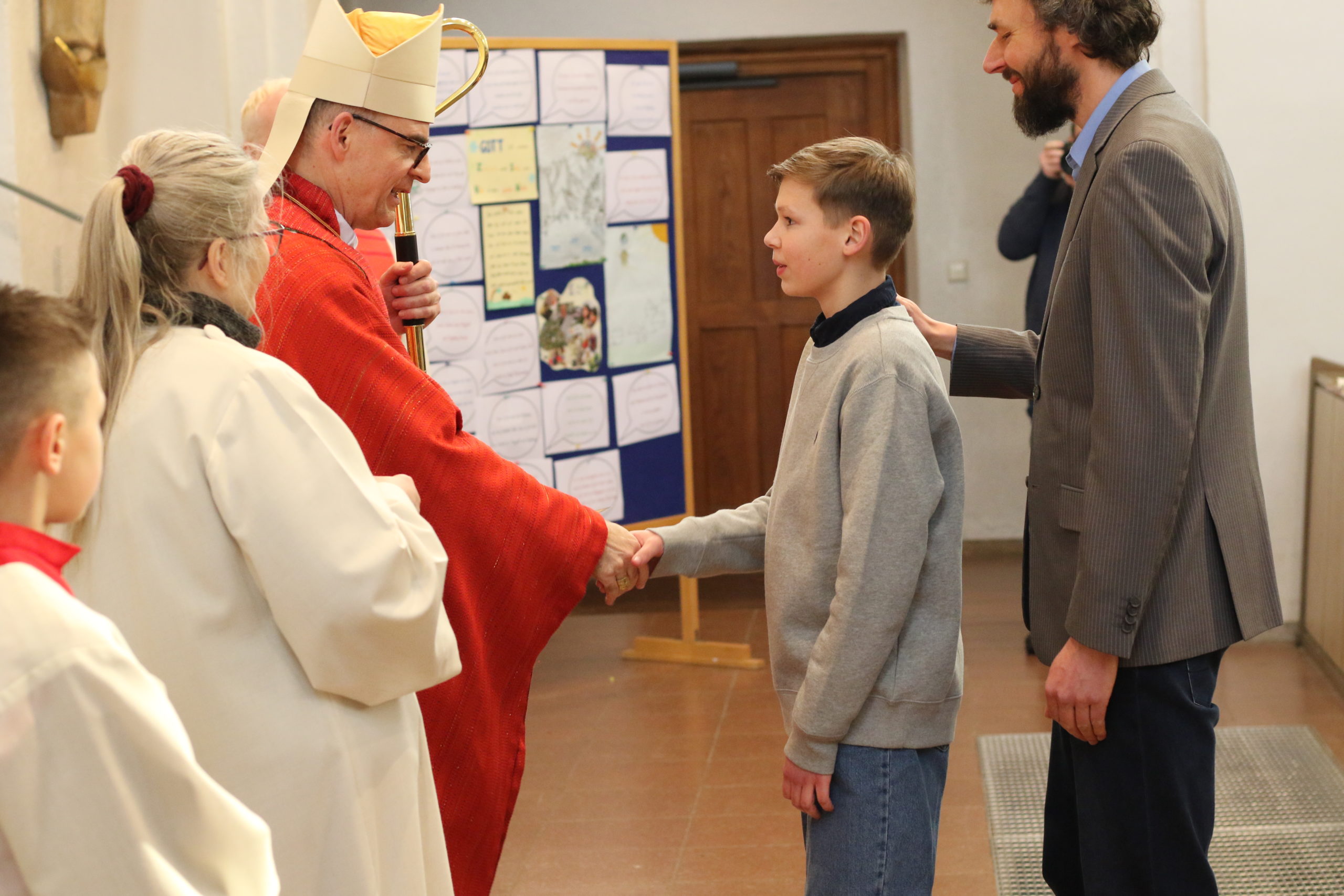 Die schwungvolle musikalische Gestaltung übernahm die Band Himmelwärts und ein gemischter Chor aus den drei Pfarreien unter der Leitung von Hendrik Frank. Ministranten aus allen drei Pfarreien haben den Gottesdienst festlich mitgestaltet. Zwei der Neugefirmten begrüßten und verabschiedeten gekonnt und soverän Bischof Jung und dankten ihm. Die Neugefirmten stellten verschiedene Ergebnisse aus der Vorbereitung vor.