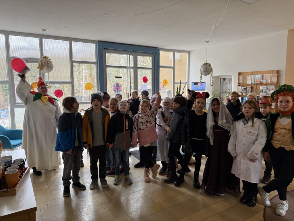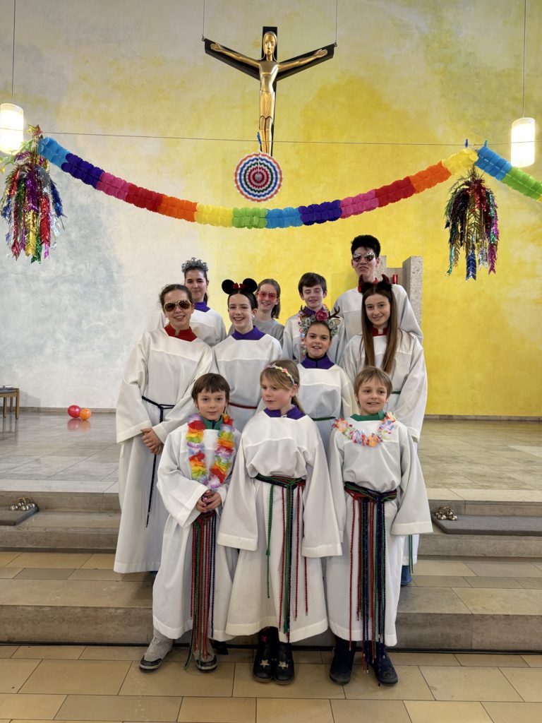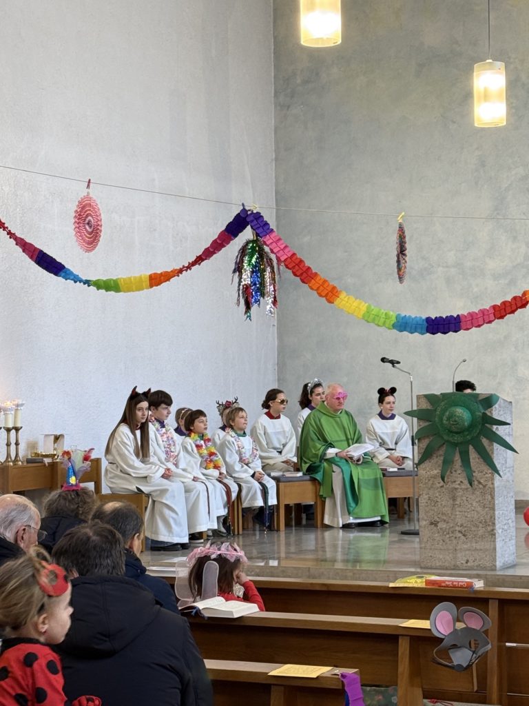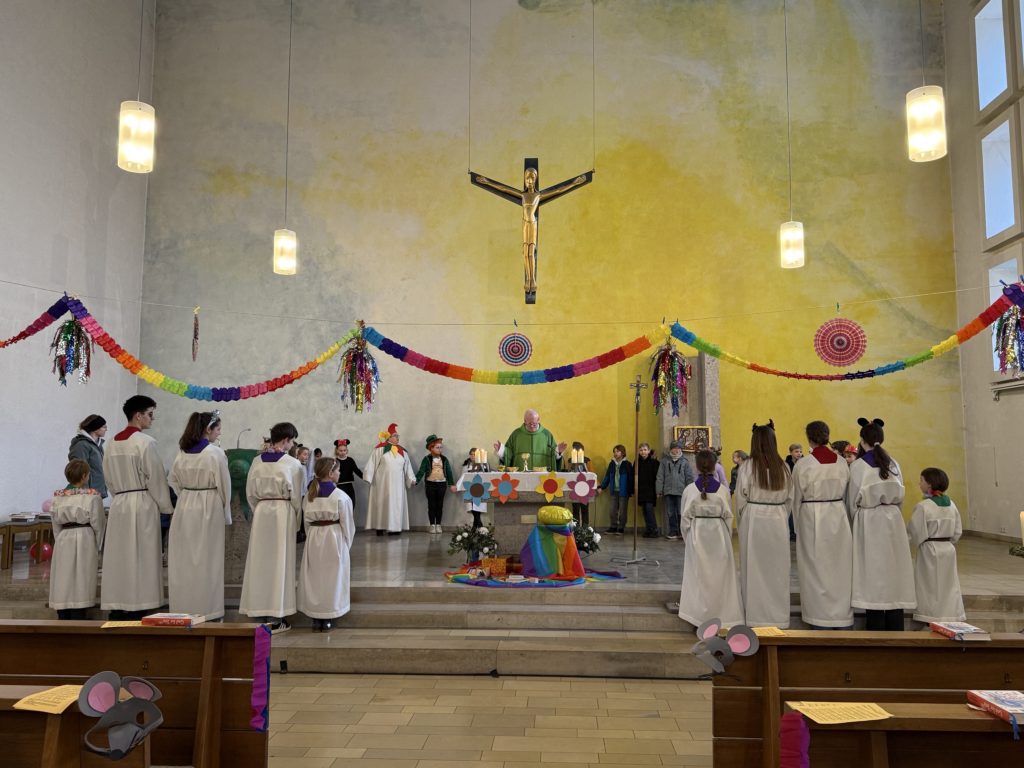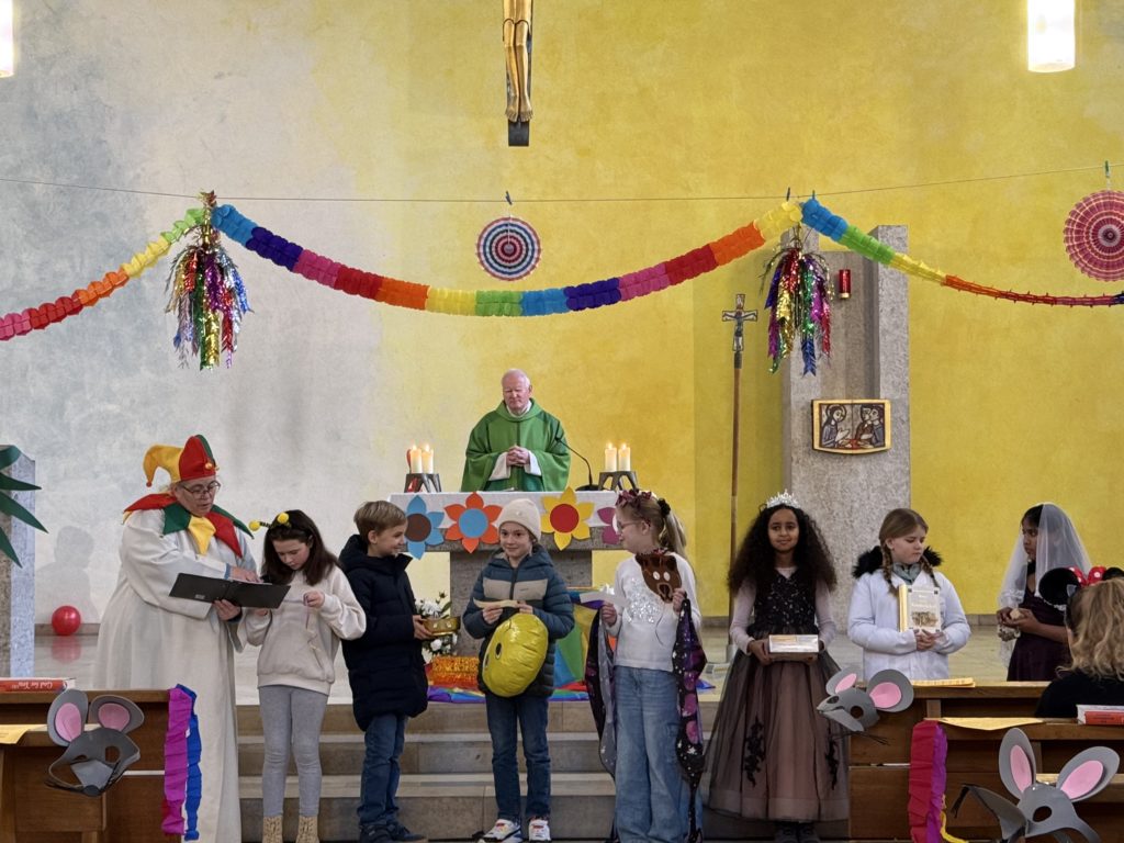 Bunt und quirlig ging es eine Woche vor dem Faschingshöhepunkt in St. Bruno zu. Ursache war der Besuch zahlreicher Kommunionkinder, die alle verkleidet gekommen sind. Der Pfarrer hatte eine rosa Brille auf, die Ministranten konnten sich gar nicht für eine liturgische Farbe entscheiden und trugen deshalb „bunt“. Die Gemeindereferentin kam als Harlekin und erzählte die Geschichte vom Gaukler, der im Kloster tanzte.
