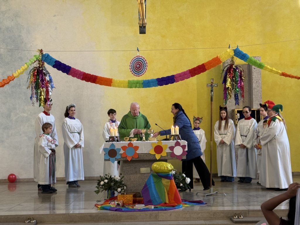 Sogar der eine oder andere Kirchenbesucher hatte sich ganz gewagt verkleidet, die Kirche hatte sich heraus geschmückt mit Luftballons im Taufbecken, Masken an den Bänken, Blumen am Altar und Girlanden.