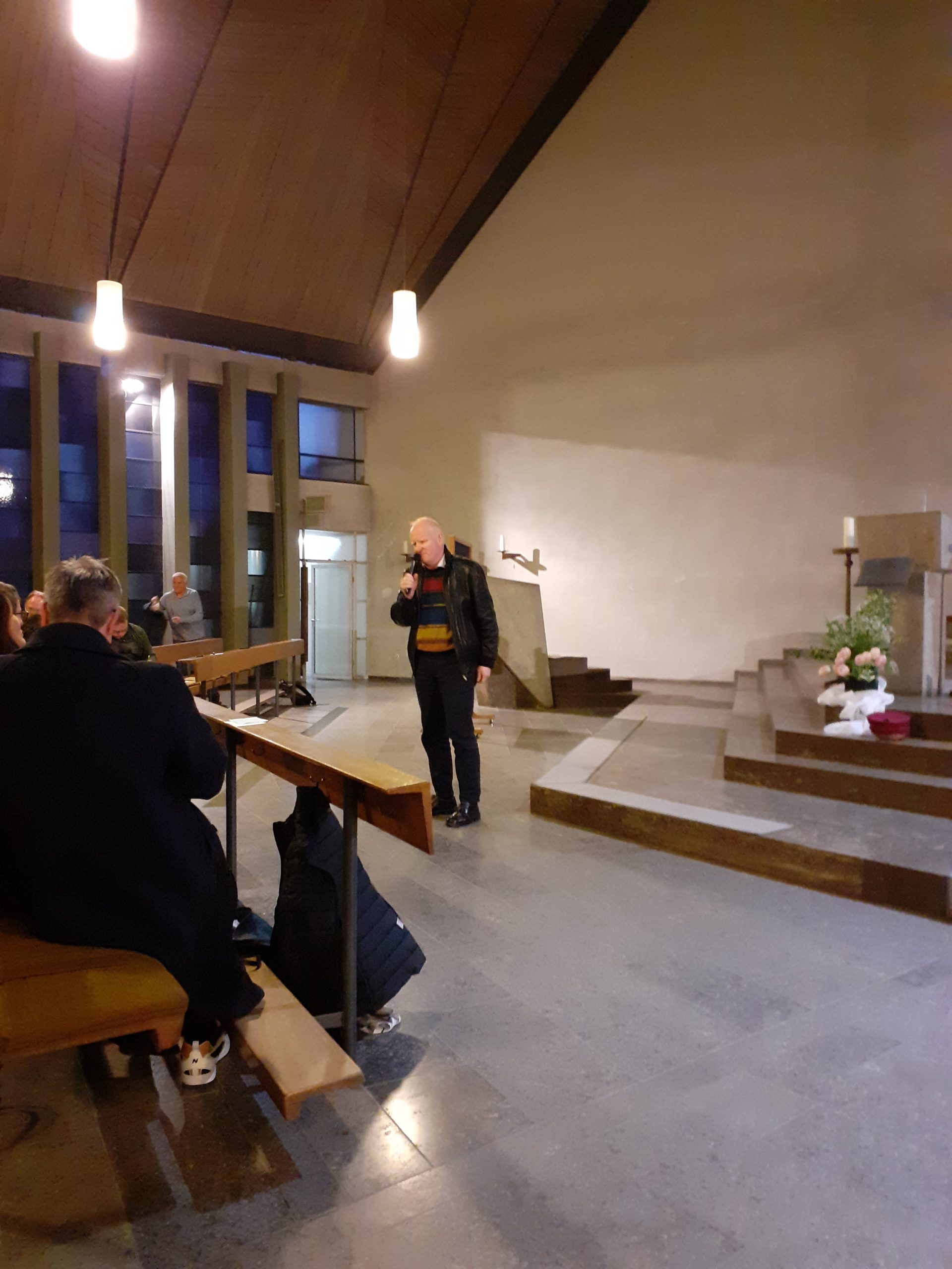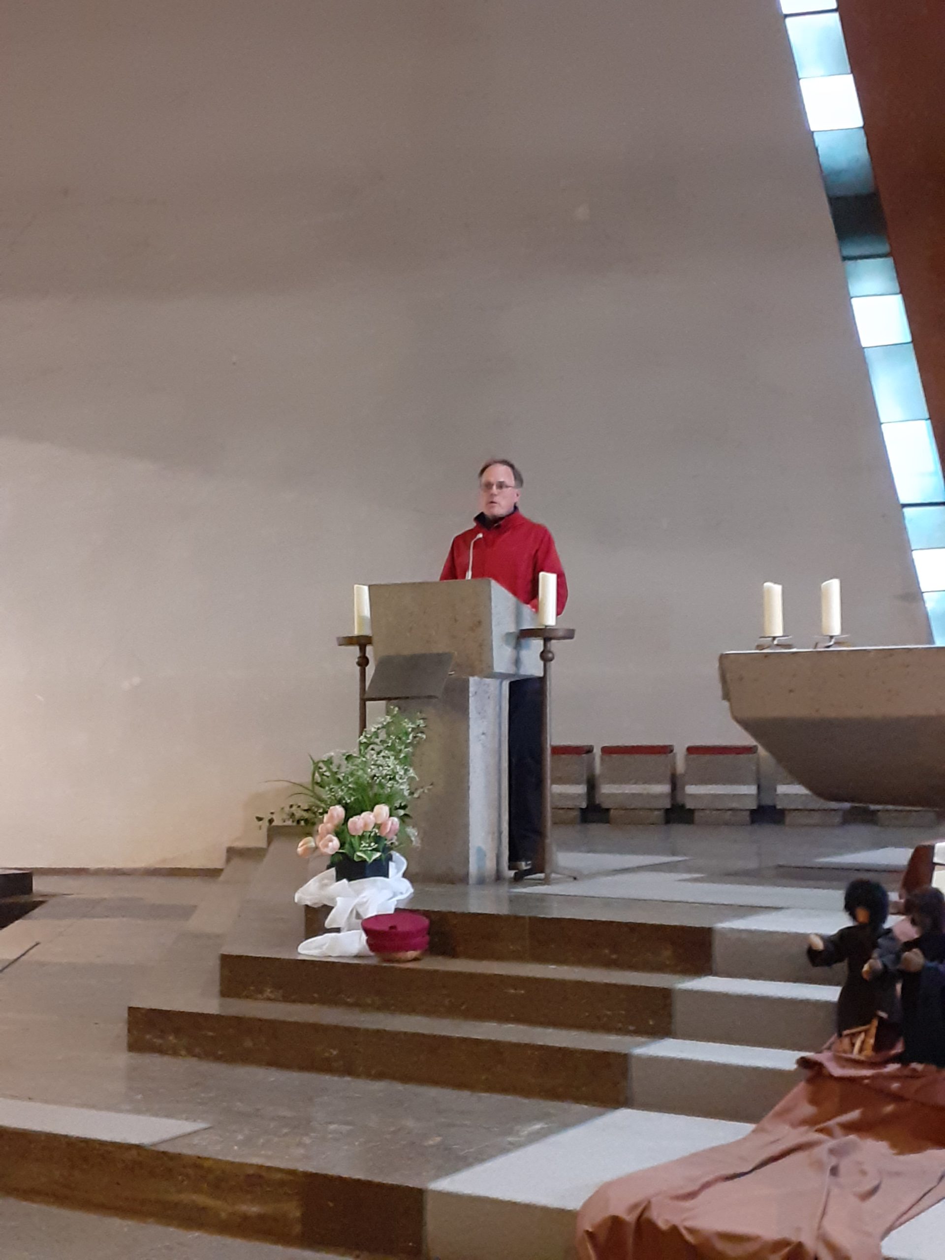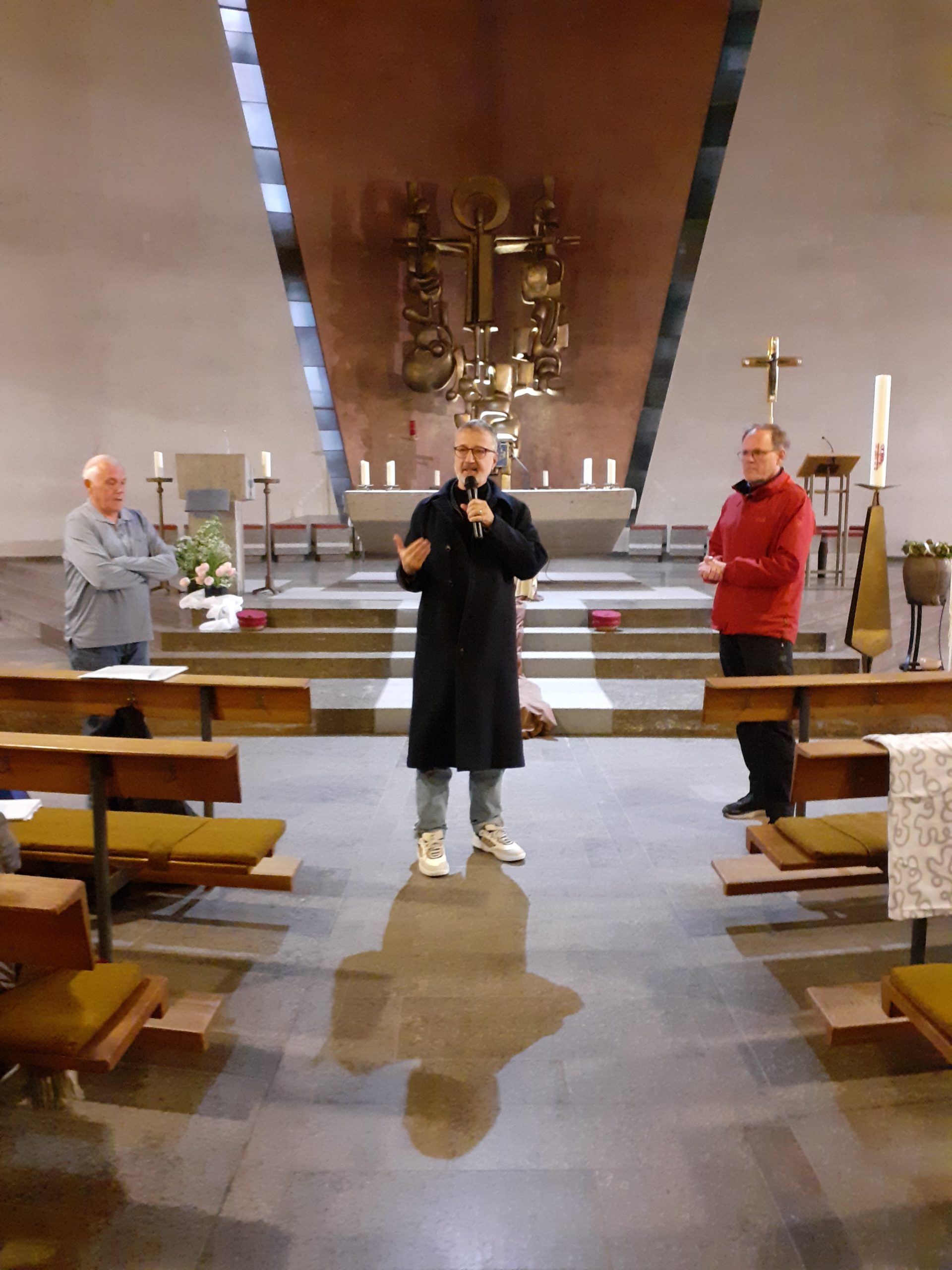 Gegen Ende brachte Pfarrer Klaus Hösterey noch den folgenden Gedanken ein: die Kirche „Zur Heiligen Familie“ sei eine Zeltkirche und ein Zelt stehe immer auch für Abbruch und Aufbruch. Ein Zelt werde an einer Stelle abgebaut, an einer anderen Stelle aber wieder aufgebaut. Dies sei mit Angst, aber auch mit Chancen verbunden.